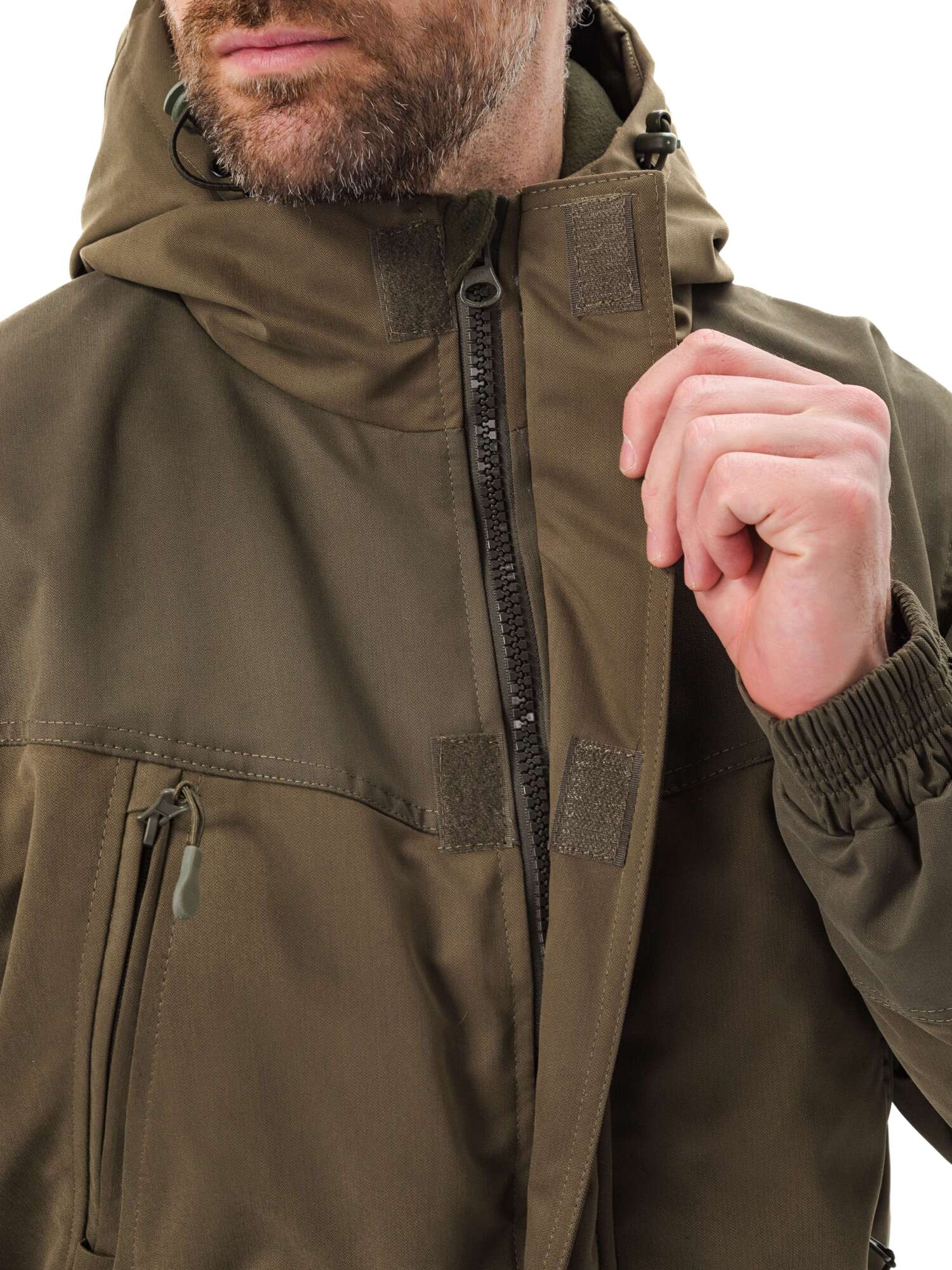 - центральная застежка на двух-замковую молнию, закрывается ветрозащитной планкой на потайных липучках, верхнюю часть молнии огибает ветровик, лицевая часть которого выполнена из мягкого флиса для более комфортного прилегания к подбородочной части лица