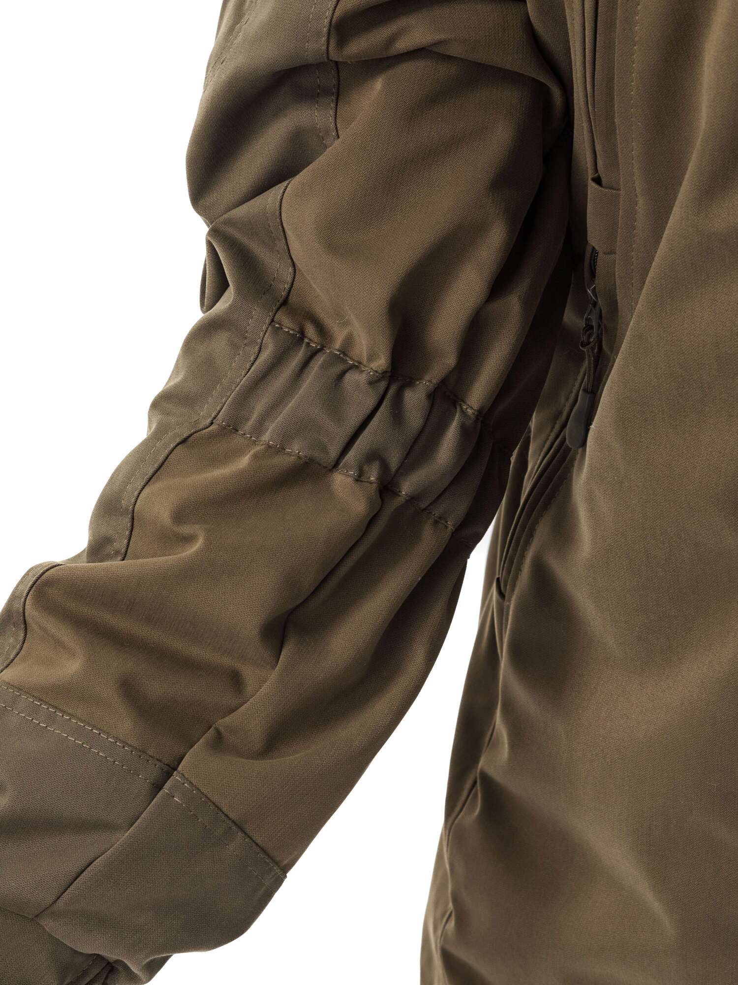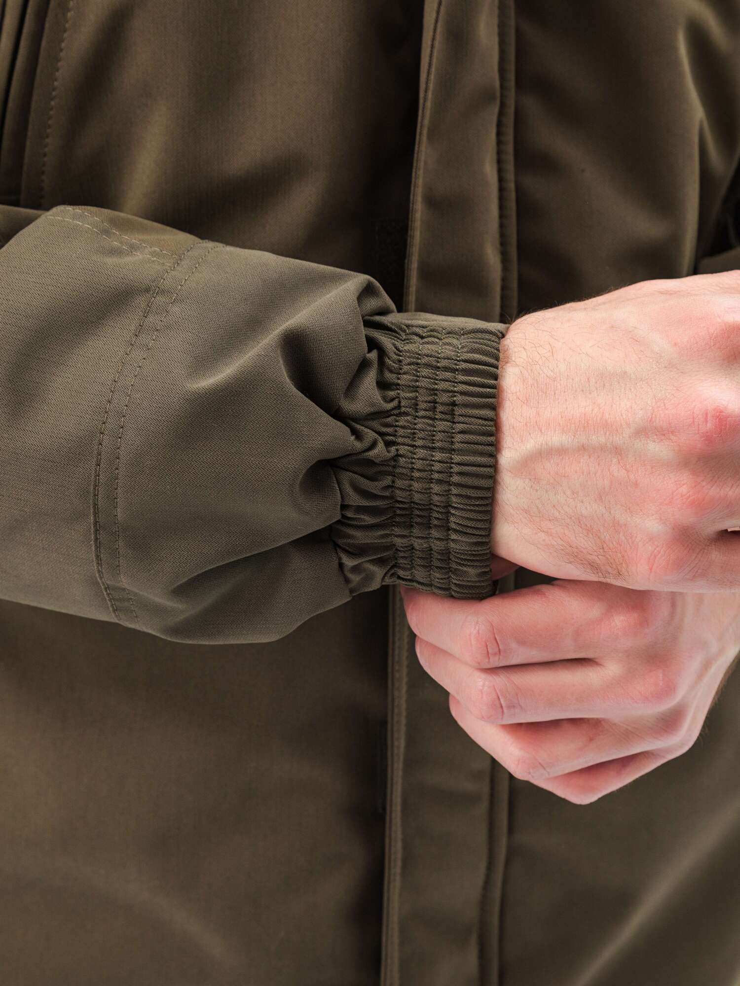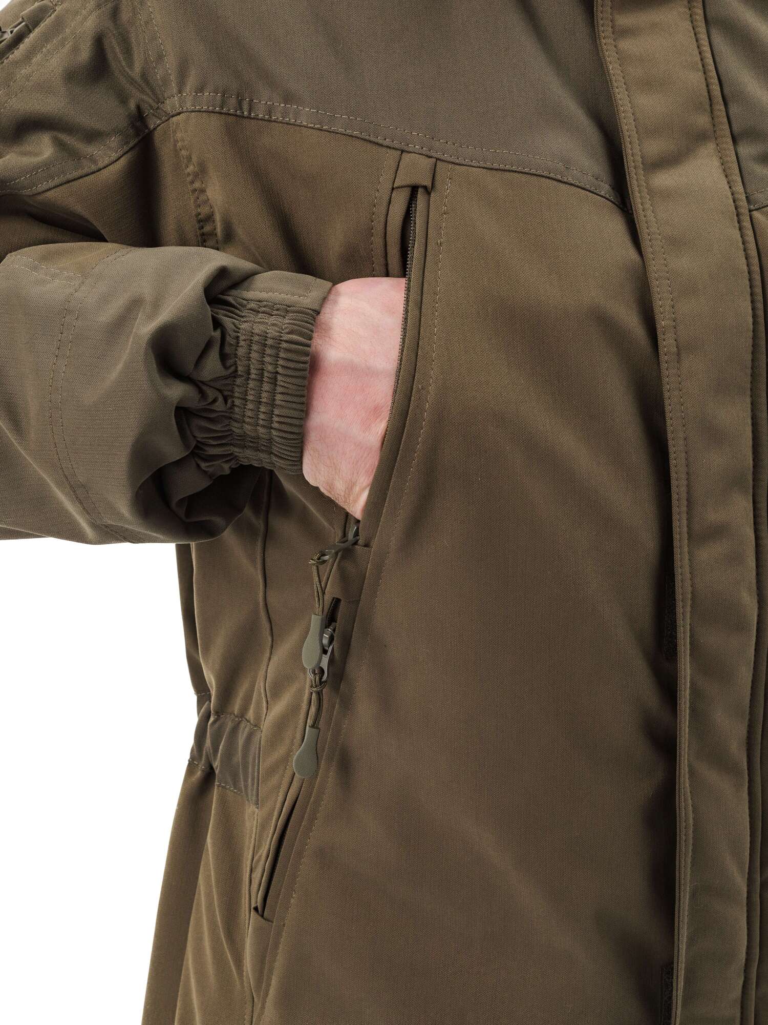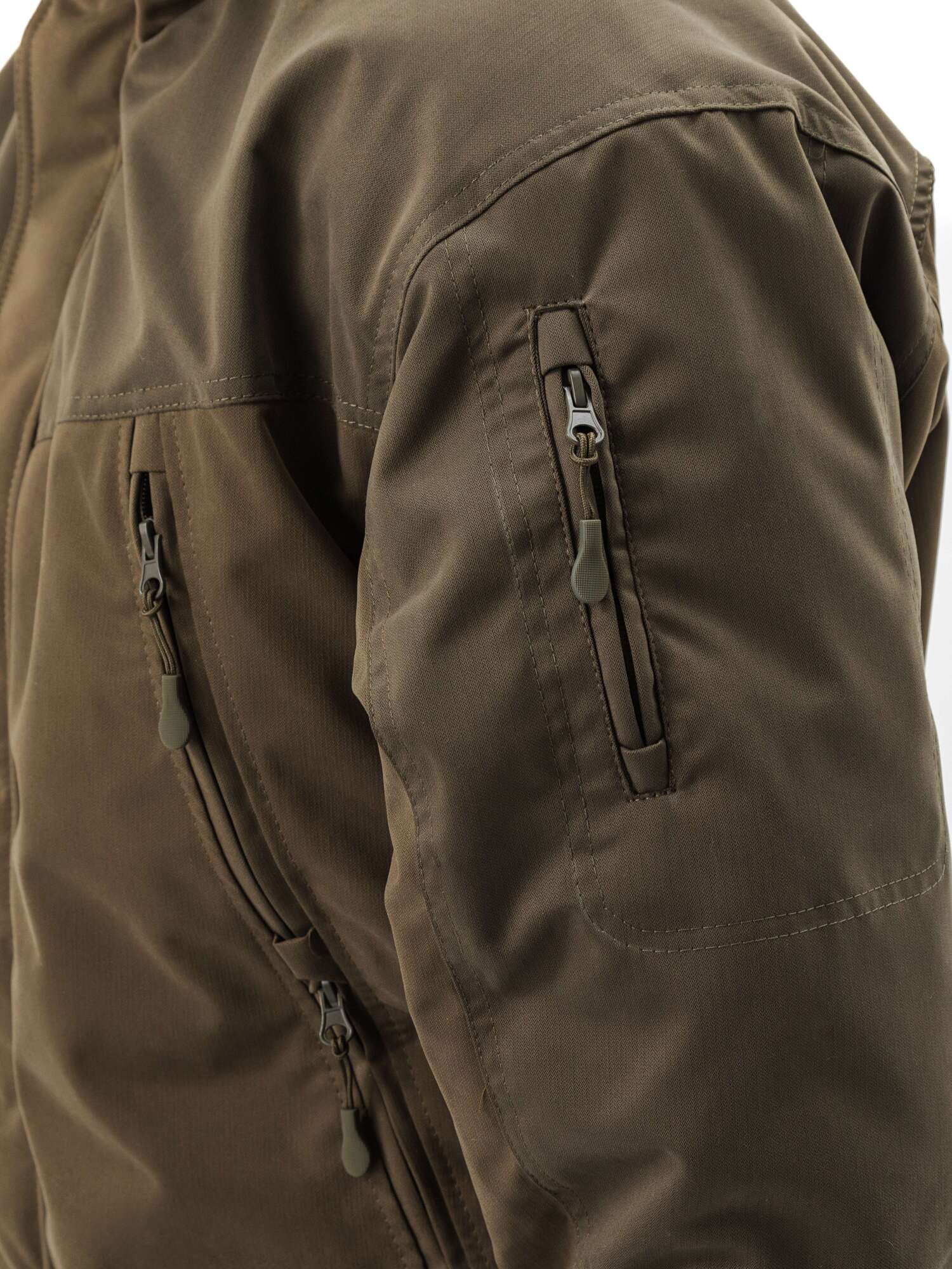 - в верхней части рукавов прорезные карманы в рамку со входом на молнию и ограничителями с двух сторон под замок, молния закрыта ветрозащитными планками