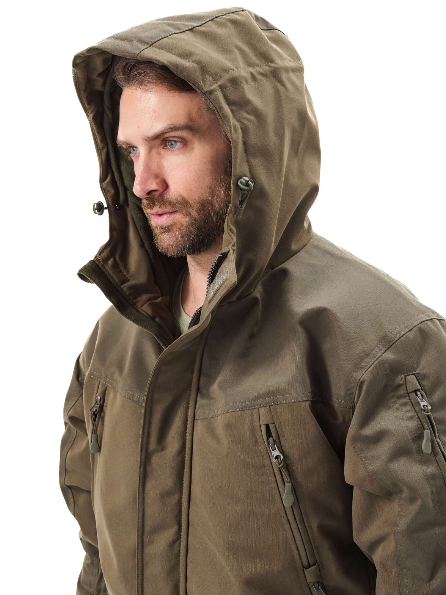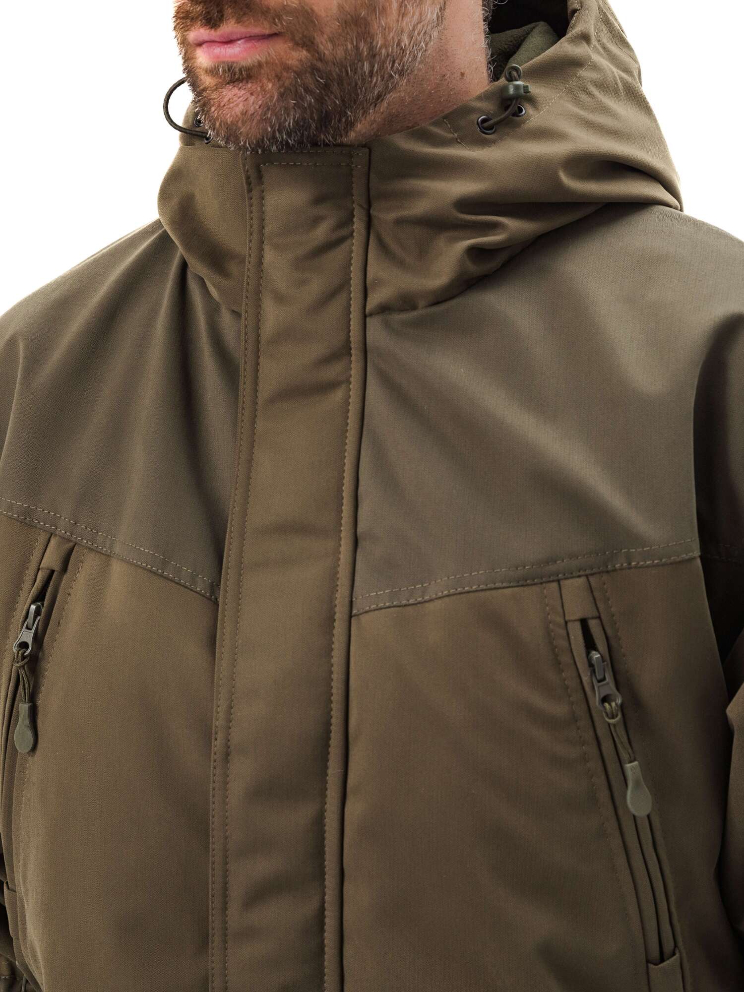 - капюшон втачной, утепленный мягким флисом и одним слоем утеплителя, с цельнокроеным козырьком, лицевая и затылочная часть с кулисками для регулировки по объему и высоте, утяжкой служит шнур-резинка и фиксаторы