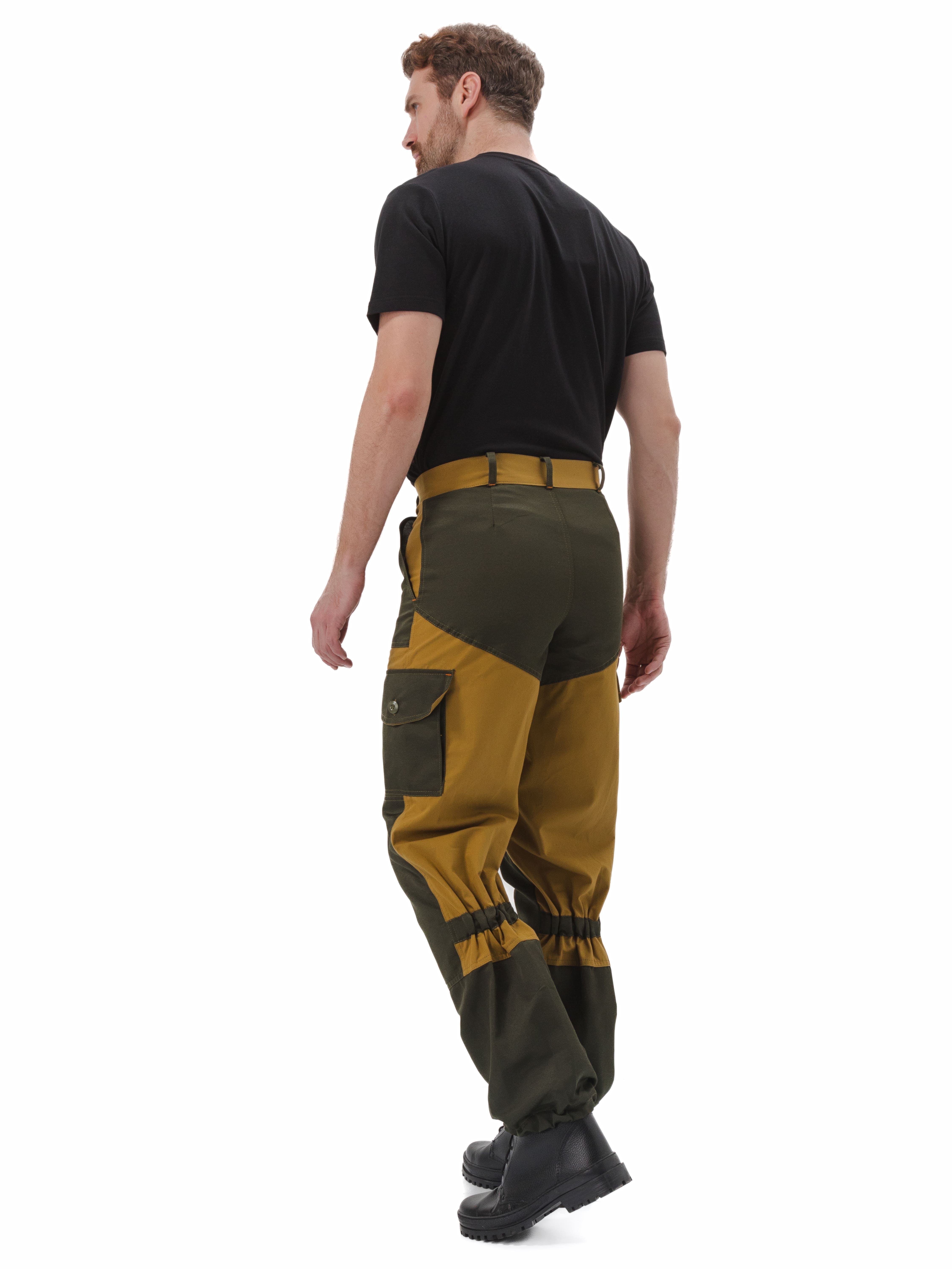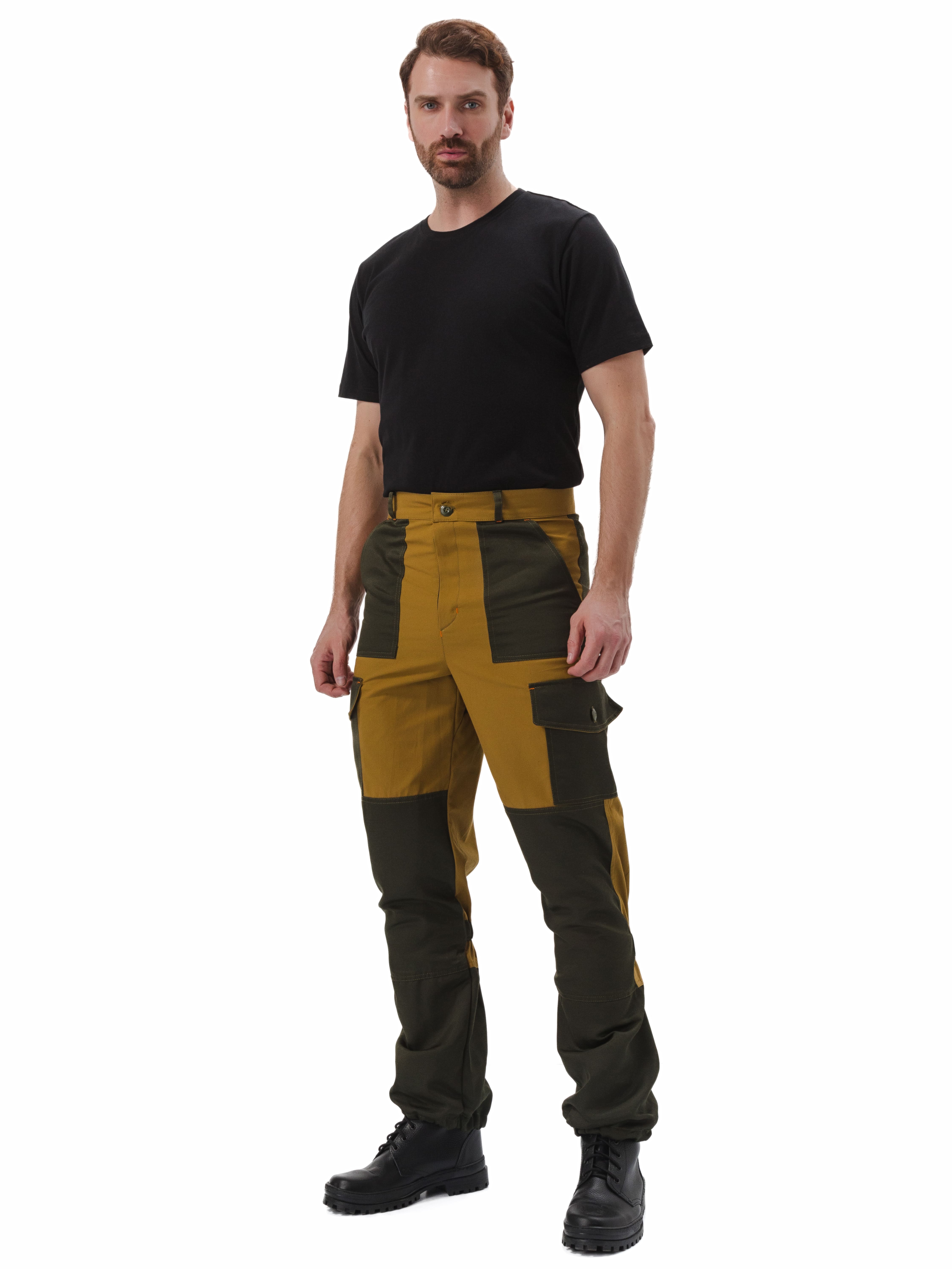 • брюки свободного кроя с притачным поясом, застегивающимся на петлю и пуговицу, шлевки из отделочной ткани для дополнительного применения ремня;