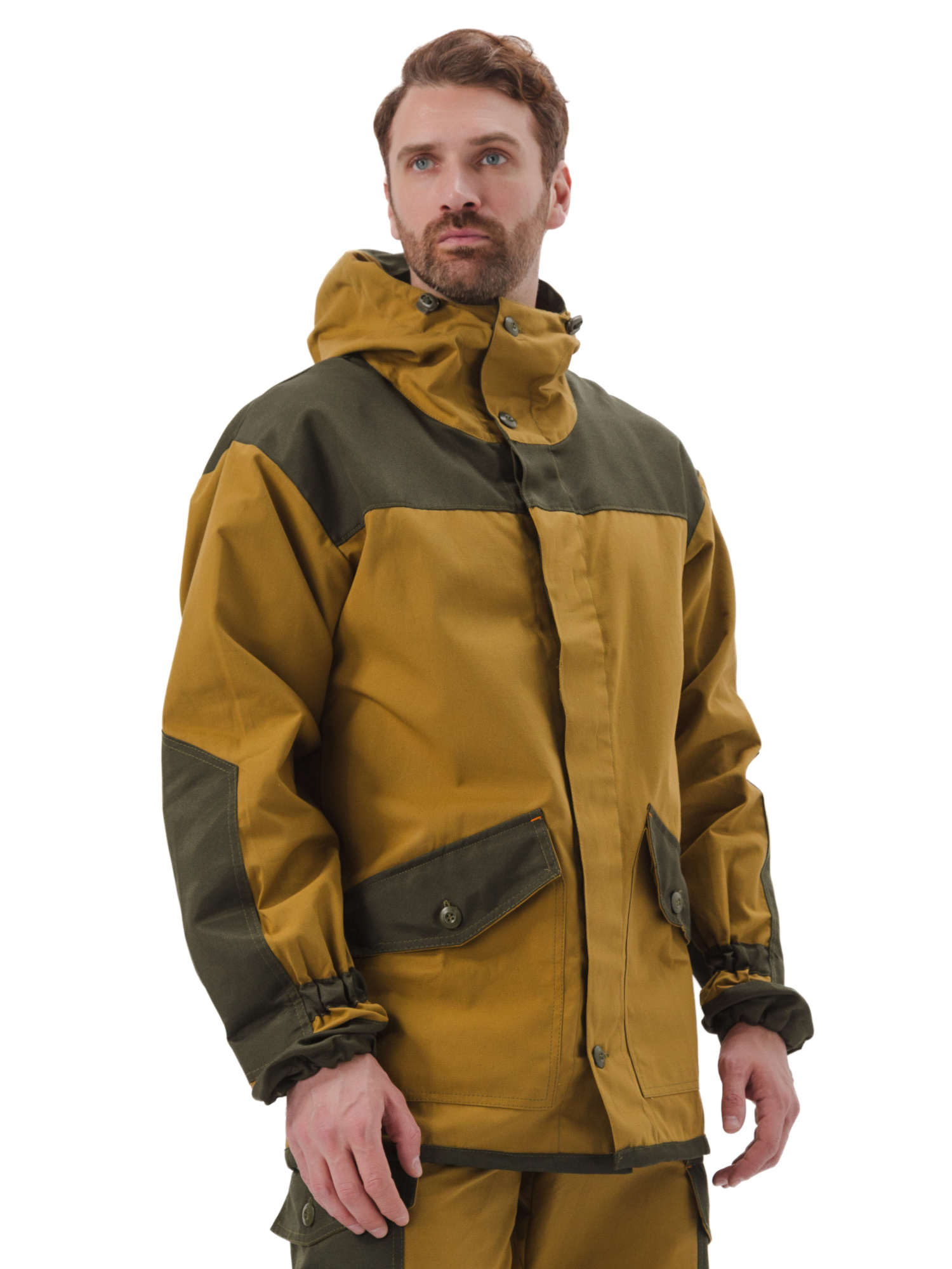 • капюшон втачной с углубленной линией горловины, что дает свободу движения в области шеи, с застежкой на две петли и пуговицы, по лицевому вырезу утягивающая кулиса со шнуром и фиксаторами для регулировки по высоте;