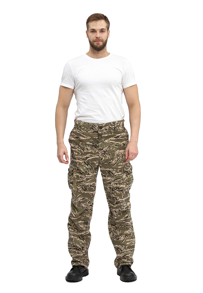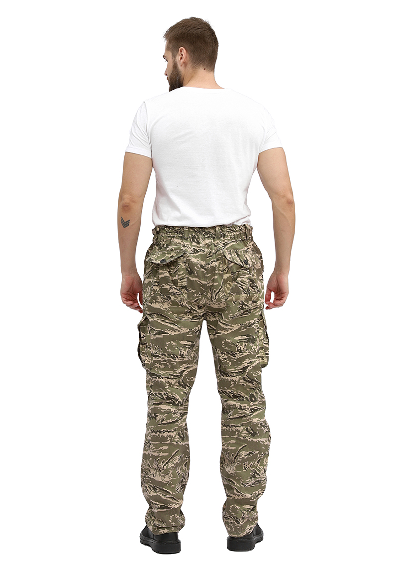 - На задних половинках и боковых участках брюк расположены накладные карманы-портфели с клапанами, застегивающимися на петлю и пуговицу