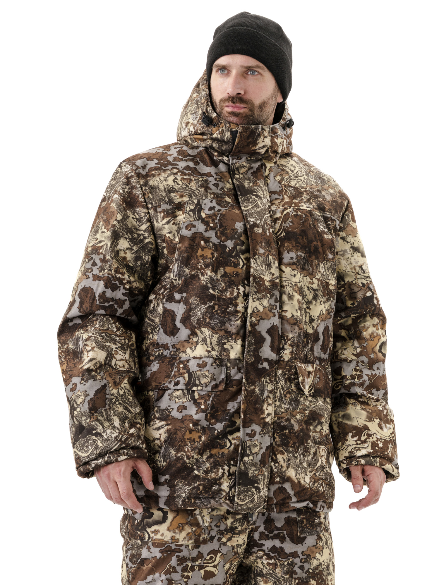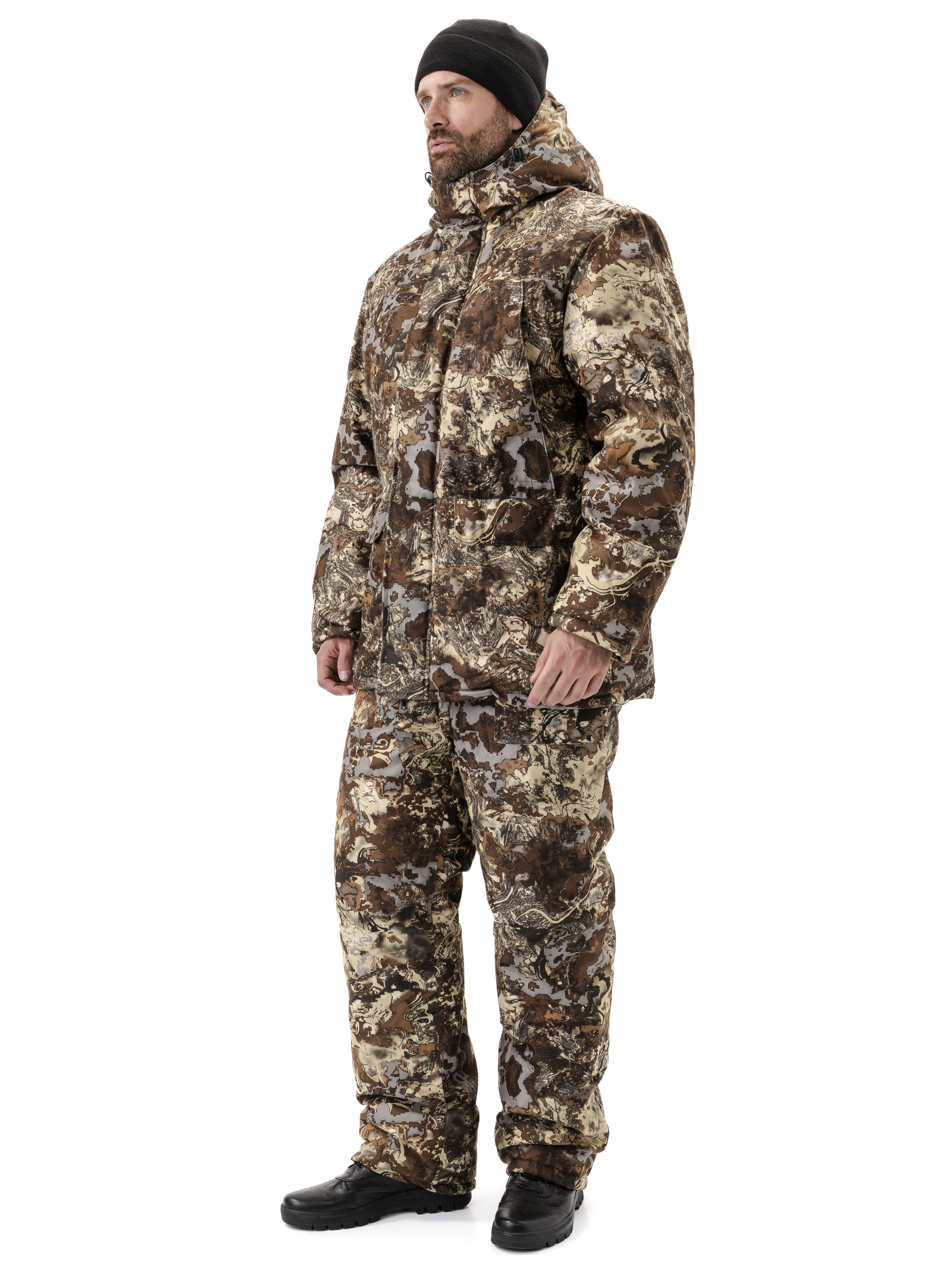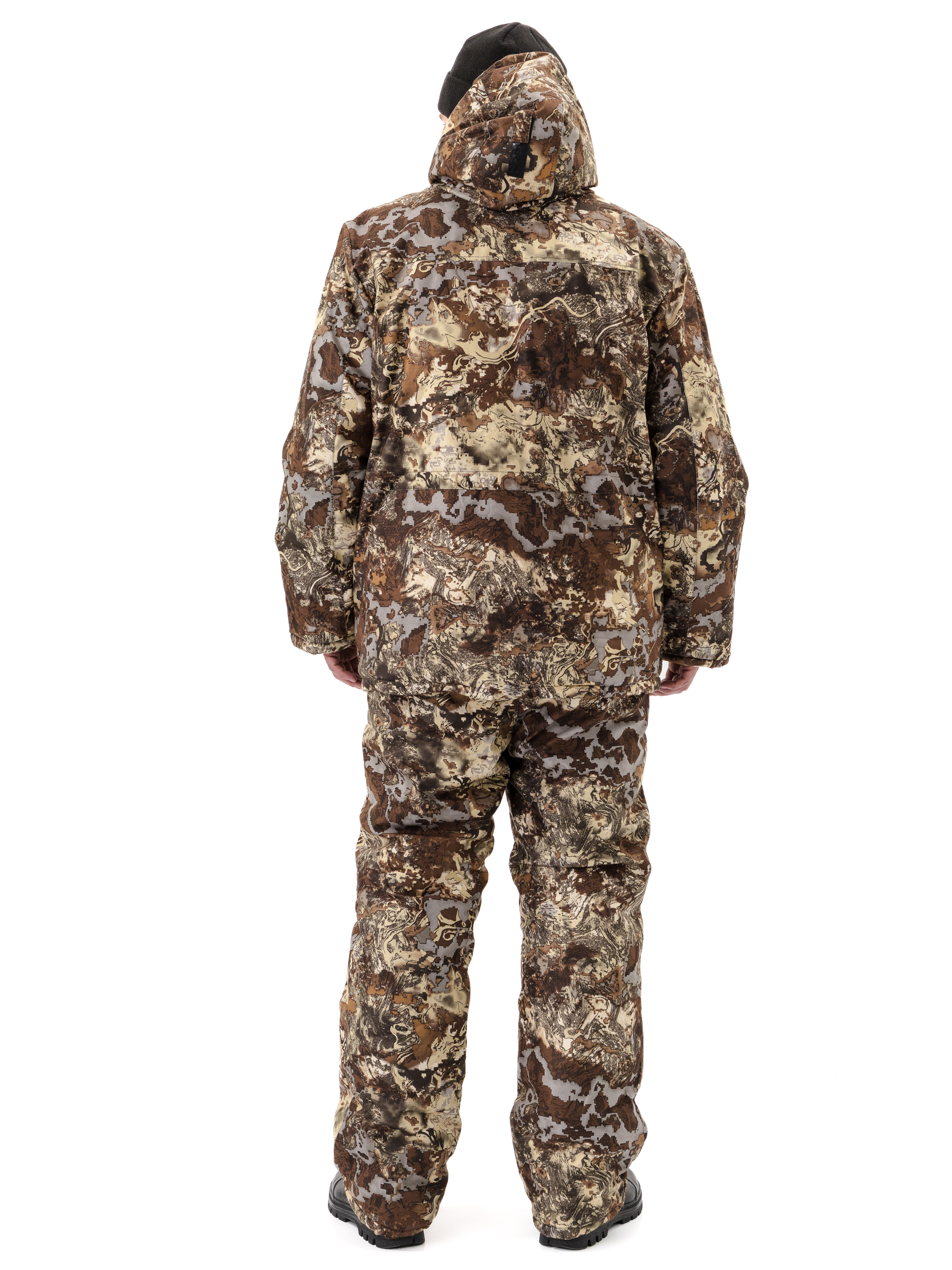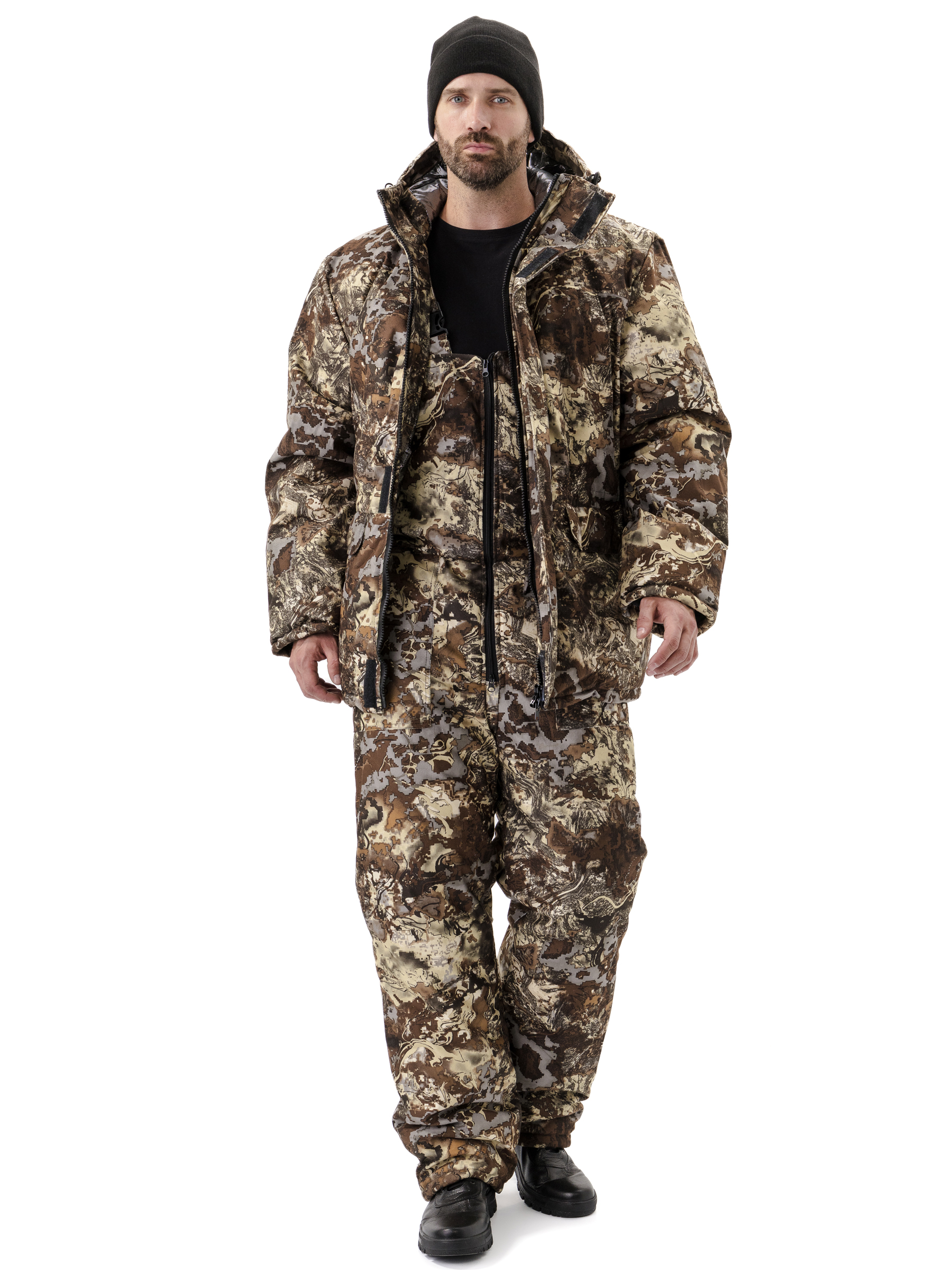 Костюм утепленный, состоит из удлинненной куртки с капюшоном и полукомбинезона.